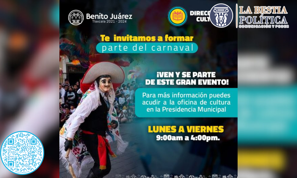 Tenemos #Carnaval en #BenitoJuárez y queremos que seas parte de la diversión de esta #Tradición A las y los interesados, pueden visitar la Oficina de Cultura de lunes a viernes, de 9 am a 4 pm. Seamos parte de las tradiciones que están llenas de color, música y alegría. #LaBestiaPolíticaBenitoJuarez #LaBestiaPolítica Laura Flores Lozano Ayuntamiento de Benito Juárez Tlaxcala Navegación de entradas El DIF Benito Juárez Entrega 100 kg de Tapitas a Fundación «Corazonadas de Amor» Descubre tu Talento en los Talleres Culturales Gratuitos de Benito Juárez