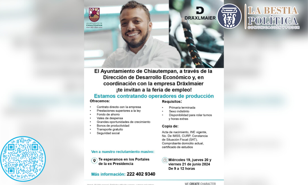 El Ayuntamiento de Chiautempan, a través de la Dirección de Desarrollo Económico y en coordinación con la empresa Draxlmaier invitan a participar en la bolsa de trabajo para operadores de producción.