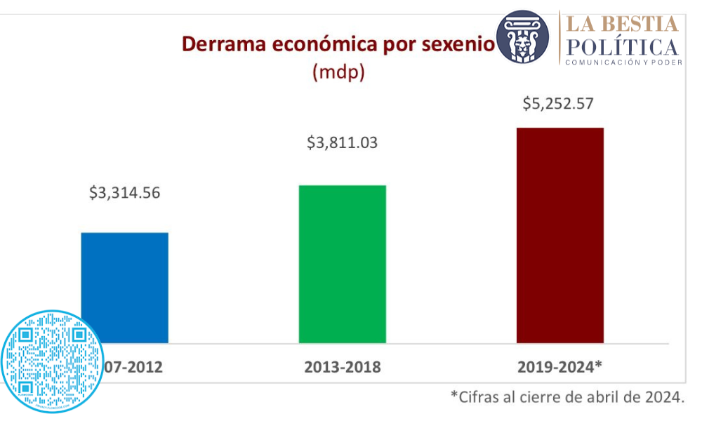 · En comparación con la administración pasada (2013-2018), la derrama económica aumentó 38%, mientras que respecto al sexenio de 2007 a 2012 se registró un incremento de 58%.