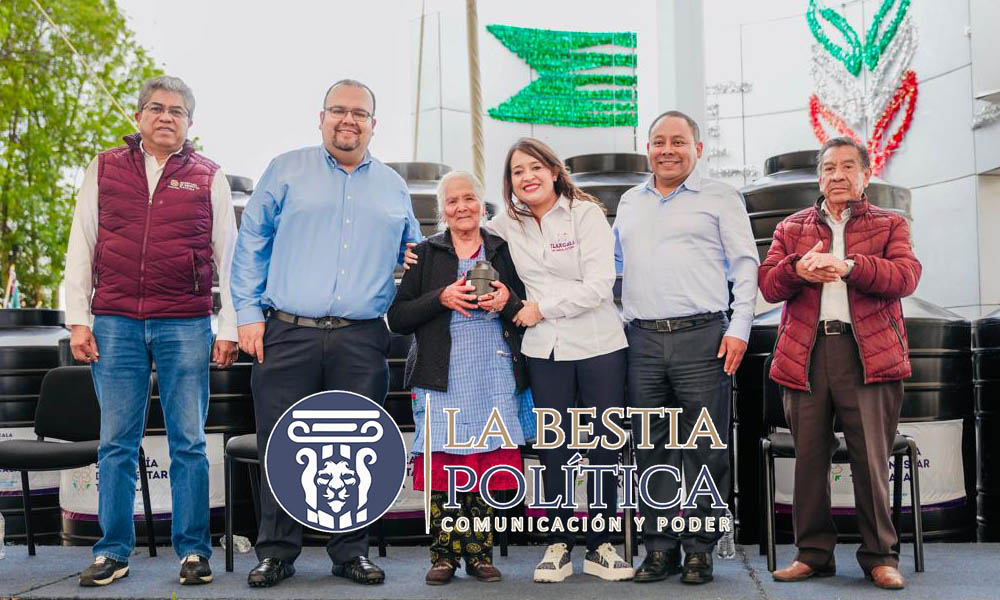Como parte del evento, Fernanda Espinosa de los Monteros Cuéllar entregó simbólicamente cinco tinacos con capacidad de almacenar mil 200 litros cada uno, de los 174 apoyos que se distribuirán a familias apizaquenses.