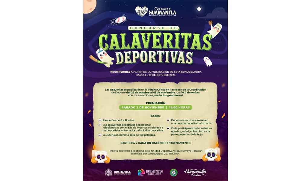 El Ayuntamiento de Huamantla, a través de la Coordinación del Deporte, abrió una convocatoria dirigida a niñas y niños de entre 6 y 12 años para que participen en el Concurso de «Calaveritas Deportivas», actividad que busca fomentar la creatividad y el amor por el deporte en los menores, en el marco de las celebraciones del Día de Muertos.