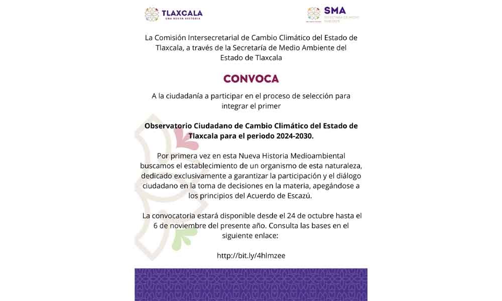 El secretario de Medio Ambiente del estado (SMA), Pedro Aquino Alvarado, en su carácter de secretario Técnico de la Comisión Intersecretarial de Cambio Climático (CICC), invitó a la población tlaxcalteca mayor de edad a participar en la Convocatoria de Proceso de Selección para la Integración del Observatorio Ciudadano de Cambio Climático para el periodo 2024-2030.