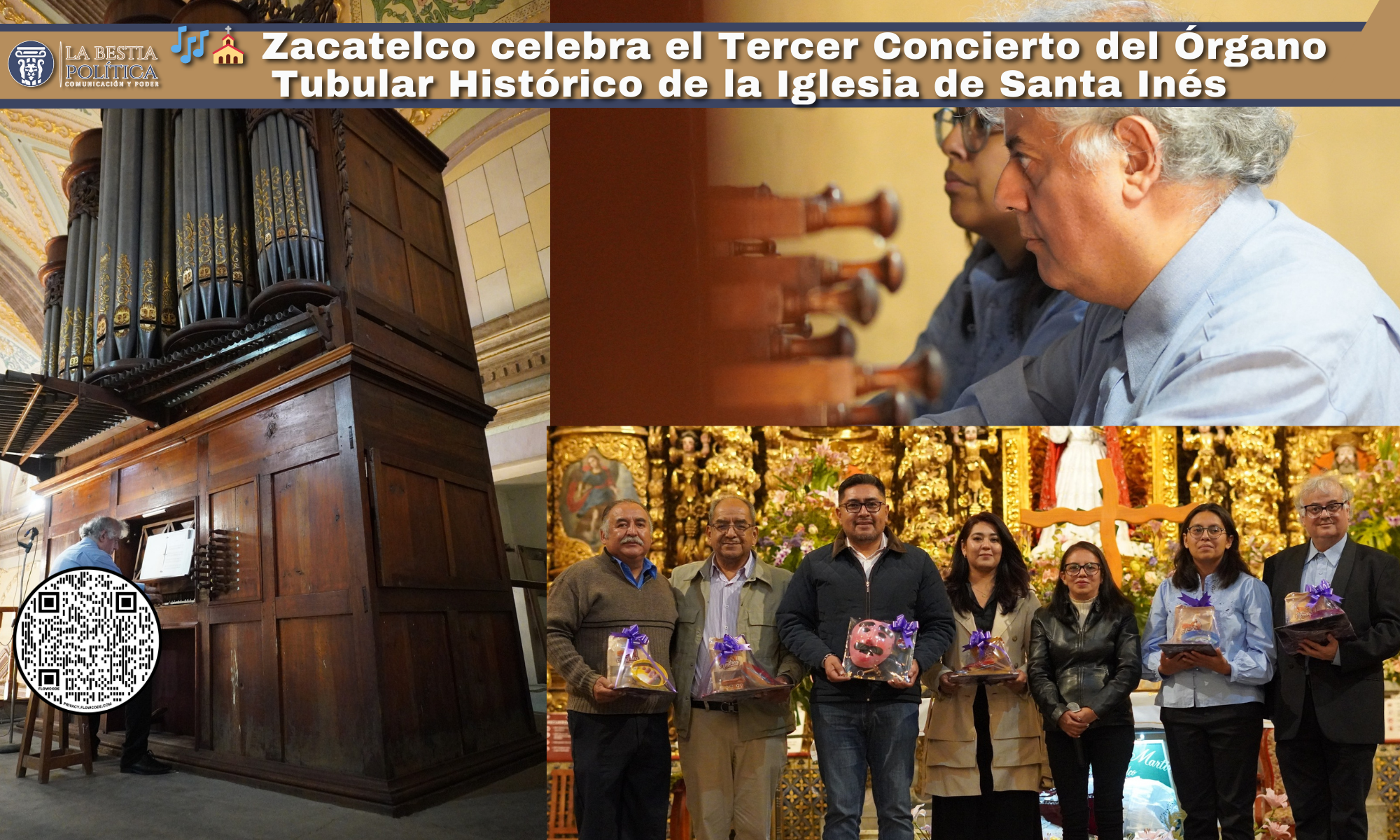 El Gobierno Municipal de Zacatelco 2024–2027 realizó con gran éxito el Tercer Concierto del Órgano Tubular Histórico en la Iglesia de Santa Inés Zacatelco, un evento cultural que reunió a autoridades, ciudadanÃa y amantes de la música para disfrutar de un instrumento emblemático del patrimonio sonoro del municipio.