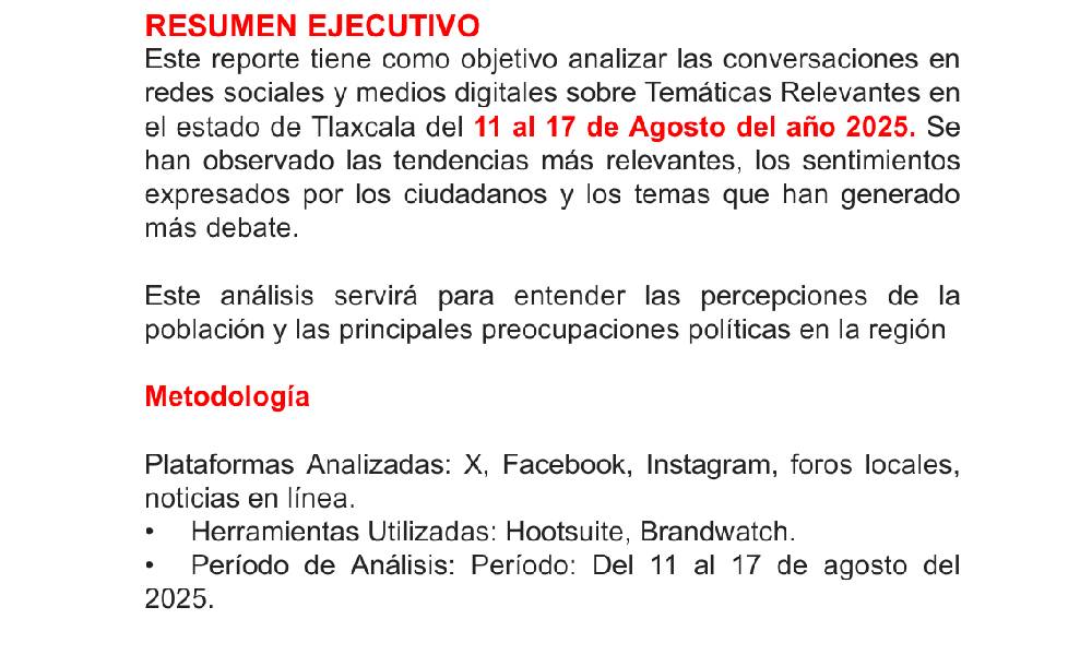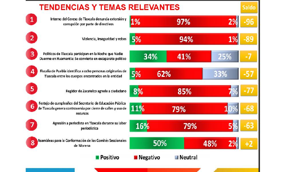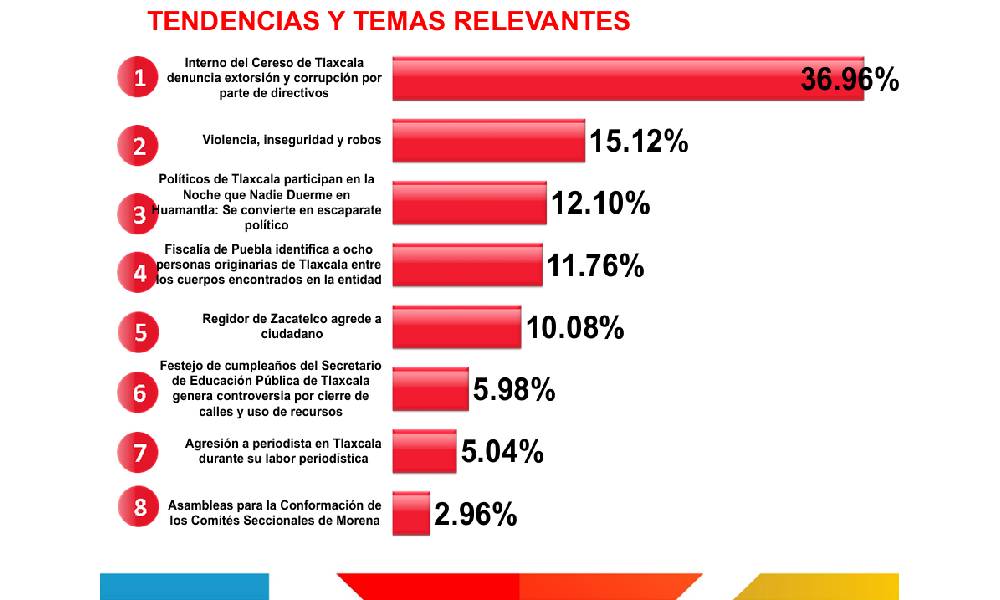 El más reciente Reporte de Escucha Digital de Impulso Mercadológico (11 al 17 de agosto de 2025) confirma que la violencia, inseguridad y robos se mantienen como uno de los principales temas de preocupación ciudadana en Tlaxcala. Representaron el 15.12% de la conversación digital, ubicándose como el segundo tema más relevante, solo detrás del escándalo de los Ceresos.