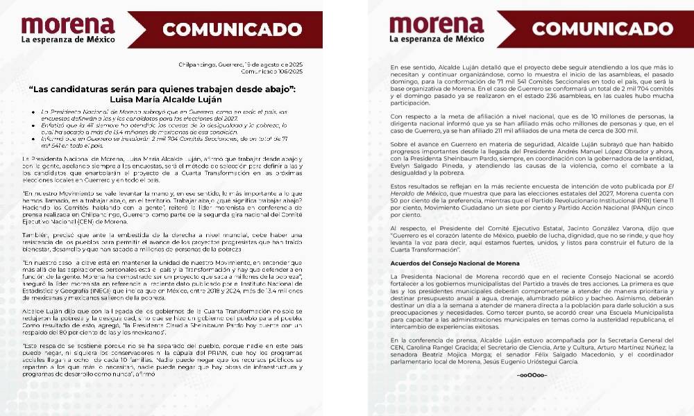 La presidenta nacional de Morena, Luisa María Alcalde Luján, subrayó que este proceso será uniforme en todo el país y que el movimiento no dará cabida a proyectos personales ni a candidaturas impuestas. “En nuestro Movimiento se vale levantar la mano, pero lo más importante es lo que hemos fundado: el trabajo abajo, en el territorio, con la gente”, expresó en conferencia de prensa desde Chilpancingo, Guerrero.