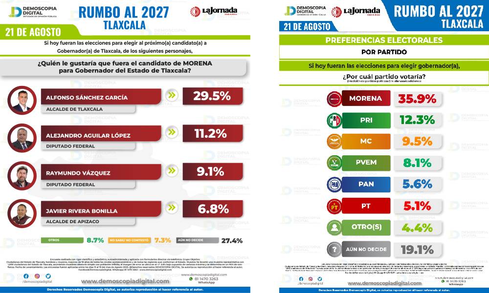 Los resultados muestran que Rivera alcanza un 24.4% de preferencia, superando al alcalde de Tlaxcala, Alfonso Sánchez García, quien registra 19.1%. Más atrás se ubican la secretaria de Turismo, Josefina Rodríguez (9.7%); el diputado federal Raymundo Vázquez (5.5%); y el legislador Alejandro Aguilar López (2.3%).