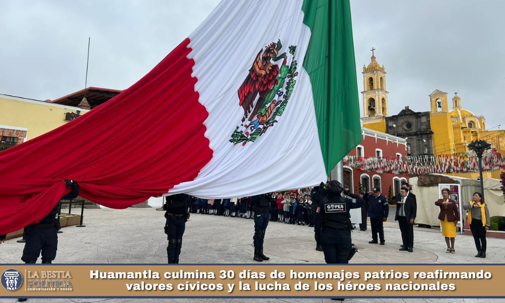 Este lunes, el Gobierno Municipal de Huamantla llevó a cabo la ceremonia de honores a los símbolos patrios e izamiento de la Bandera Nacional, con la que culminaron 30 días de homenajes realizados durante septiembre en los que se reafirmaron los valores cívicos y la lucha de los heróes nacionales