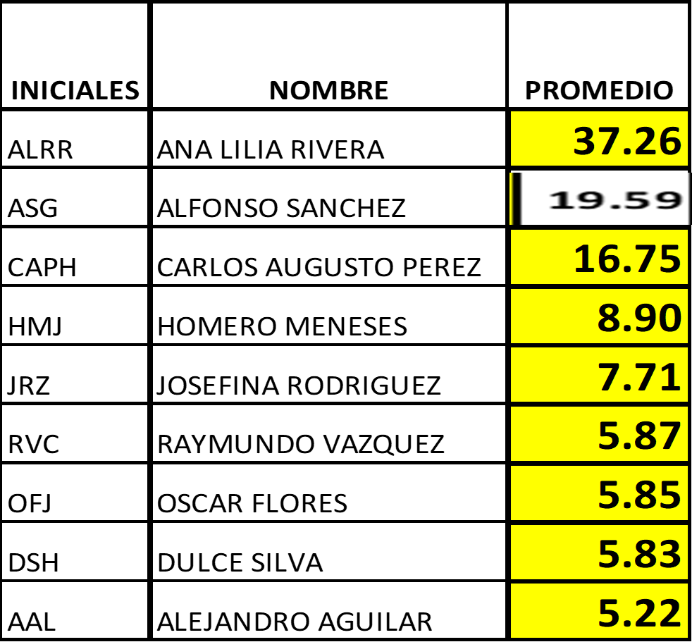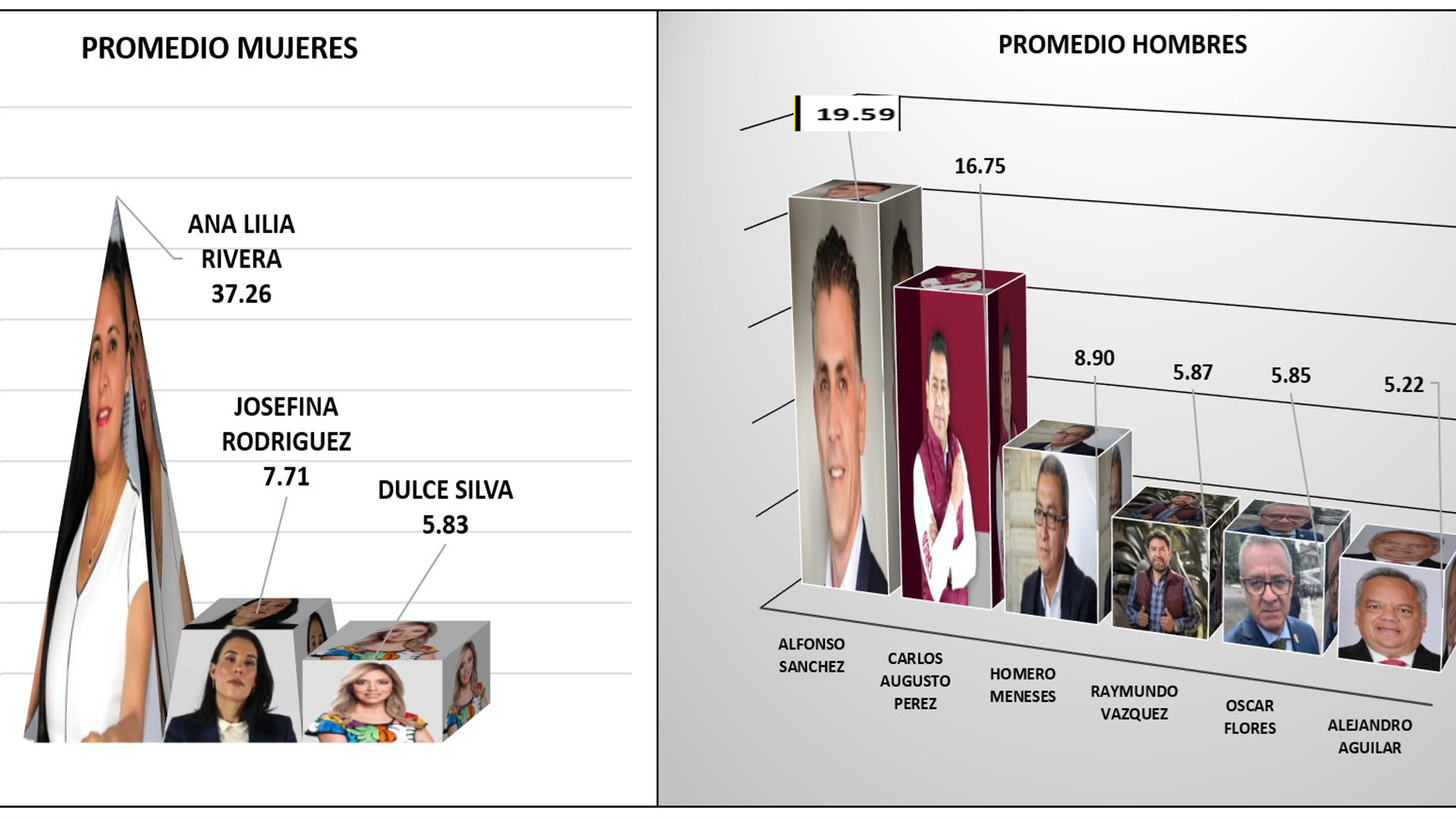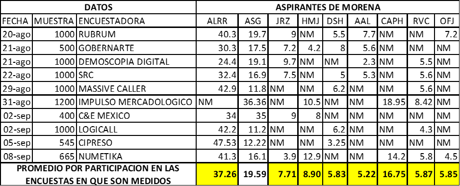 El promedio obtenido, es el que resulta de dividir las preferencias de cada aspirante morenista, entre el número de encuestas en las que participa, por eso las casillas identificadas con NM, que significa NO MEDIDO, en esa línea, es que Alfonso Sánchez es el único actor mencionado en la totalidad de mediciones revisadas, Ana Lilia Rivera en 9, tanto Rodríguez Zamora, Silva Hernández y Vázquez Conchas son medidas en 6 diferentes estudios, Alejandro Aguilar López y Homero Meneses Hernández, en 4 y Oscar Flores junto Carlos Augusto Pérez en 2.