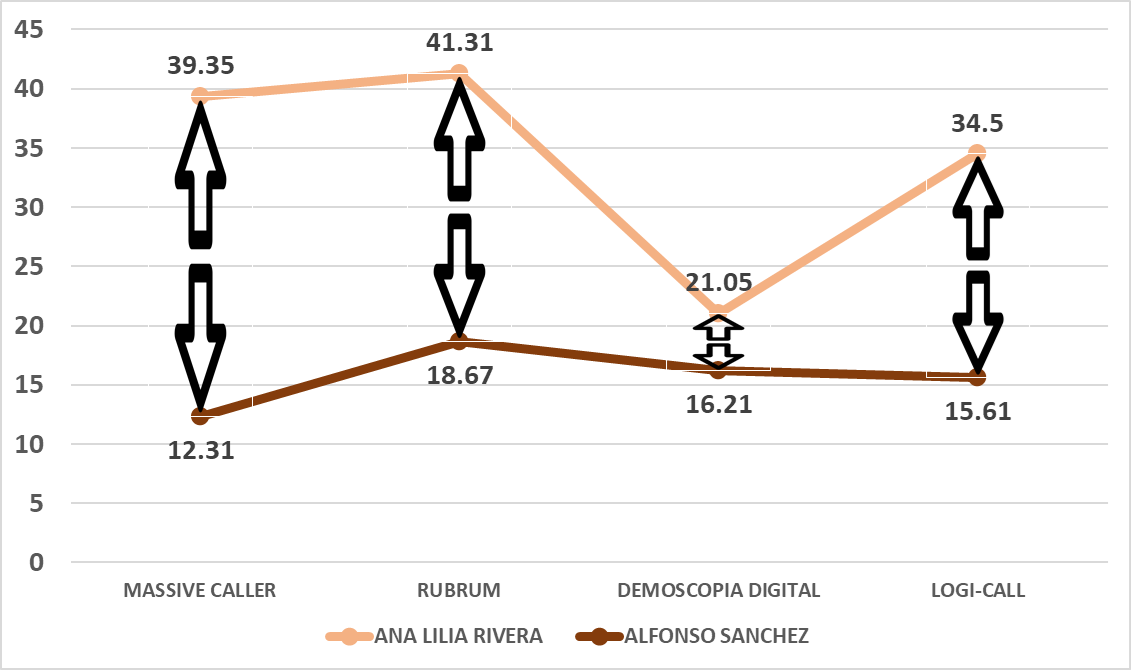 - DEMOSCOPIA DIGITAL con 5.6% y MASSIVE CALLER con 8.2, lo ubican por debajo de los 10 puntos.