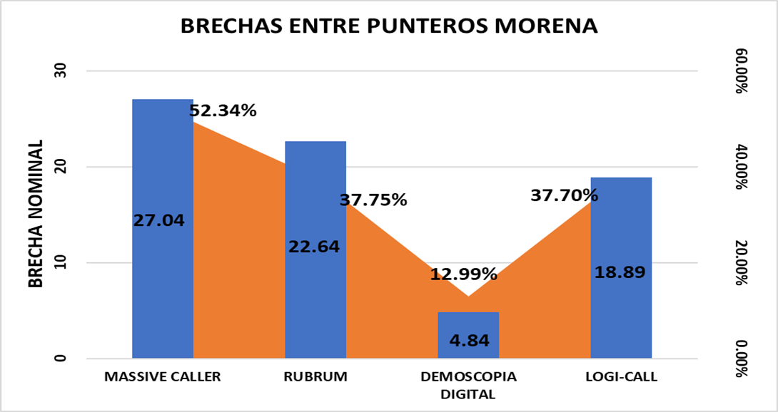 En términos nominales, la diferencia es de 27 puntos en MASSIVE CALLER, de 22.64 en RUBRUM, de 5 en DEMOSCOPIA DIGITAL y de 19 en LOGI-CALL. Pero cuando lo vemos en términos porcentuales, esta diferencia es por demás reveladora, pues en el caso del tracking de la empresa MASSIVE CALLER la BRECHA PORCENTUAL, llega a 52.34 puntos porcentuales, 37.7 en los promedios de RUBRUM y de LOGI-CALL; en tanto que, en Demoscopia, la Brecha es de 13% así lo apreciamos en la siguiente gráfica:
