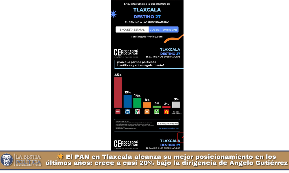 De acuerdo con la más reciente encuesta estatal “Destino 27” elaborada por CE Research, el Partido Acción Nacional en Tlaxcala registra un 19% de identificación y voto regular, consolidándose como la segunda fuerza política en el estado y marcando un crecimiento sostenido rumbo a las elecciones de 2027.