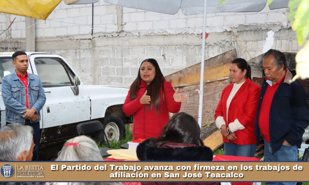El Partido del Trabajo en Tlaxcala (PT) reafirma su compromiso con la Cuarta Transformación y con los principios que la impulsan: honestidad, justicia social y cercanía con el pueblo. Con esa convicción, el PT continúa trabajando en la campaña de afiliación en el municipio de San José Teacalco, fortaleciendo así su presencia territorial y el vínculo con las comunidades tlaxcaltecas.