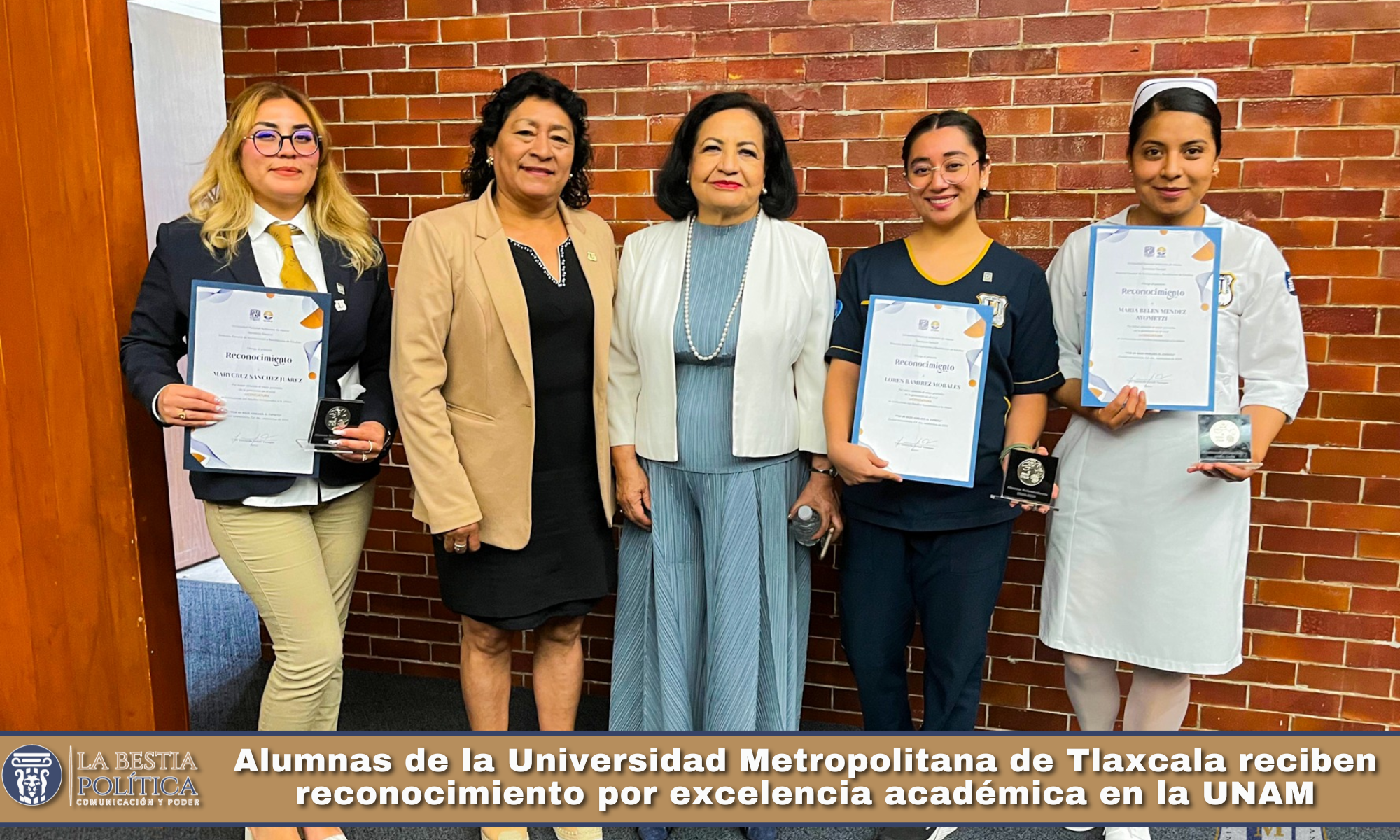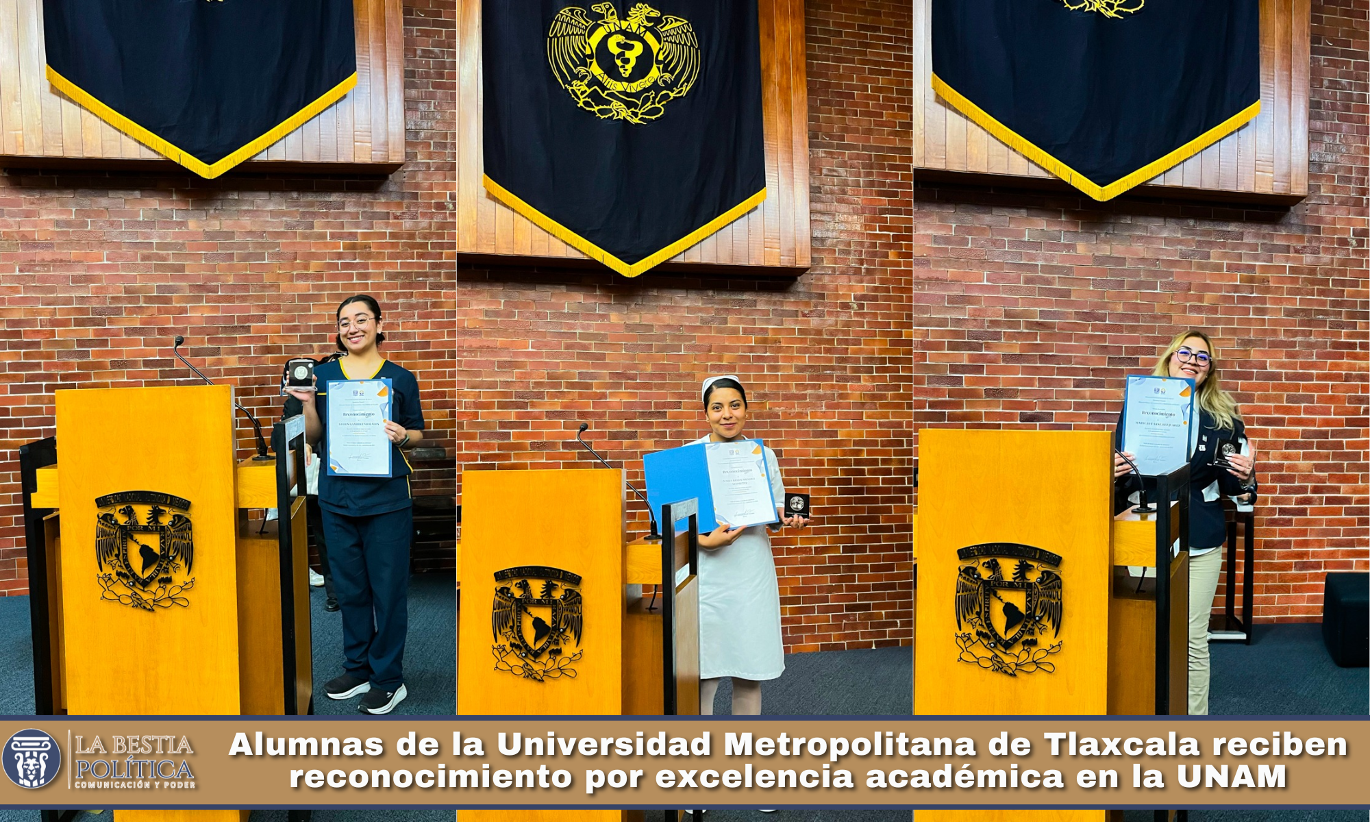 La Universidad Metropolitana de Tlaxcala celebró el logro de sus alumnas María Belén Méndez Ayometzi, de la Licenciatura en Enfermería; Loren Ramírez Morales, de Fisioterapia; y Maricruz Sánchez Juárez, de Derecho, quienes fueron reconocidas por su destacada trayectoria académica durante la Ceremonia de Alumnos Sobresalientes del Sistema Incorporado a la Universidad Nacional Autónoma de México (UNAM).
