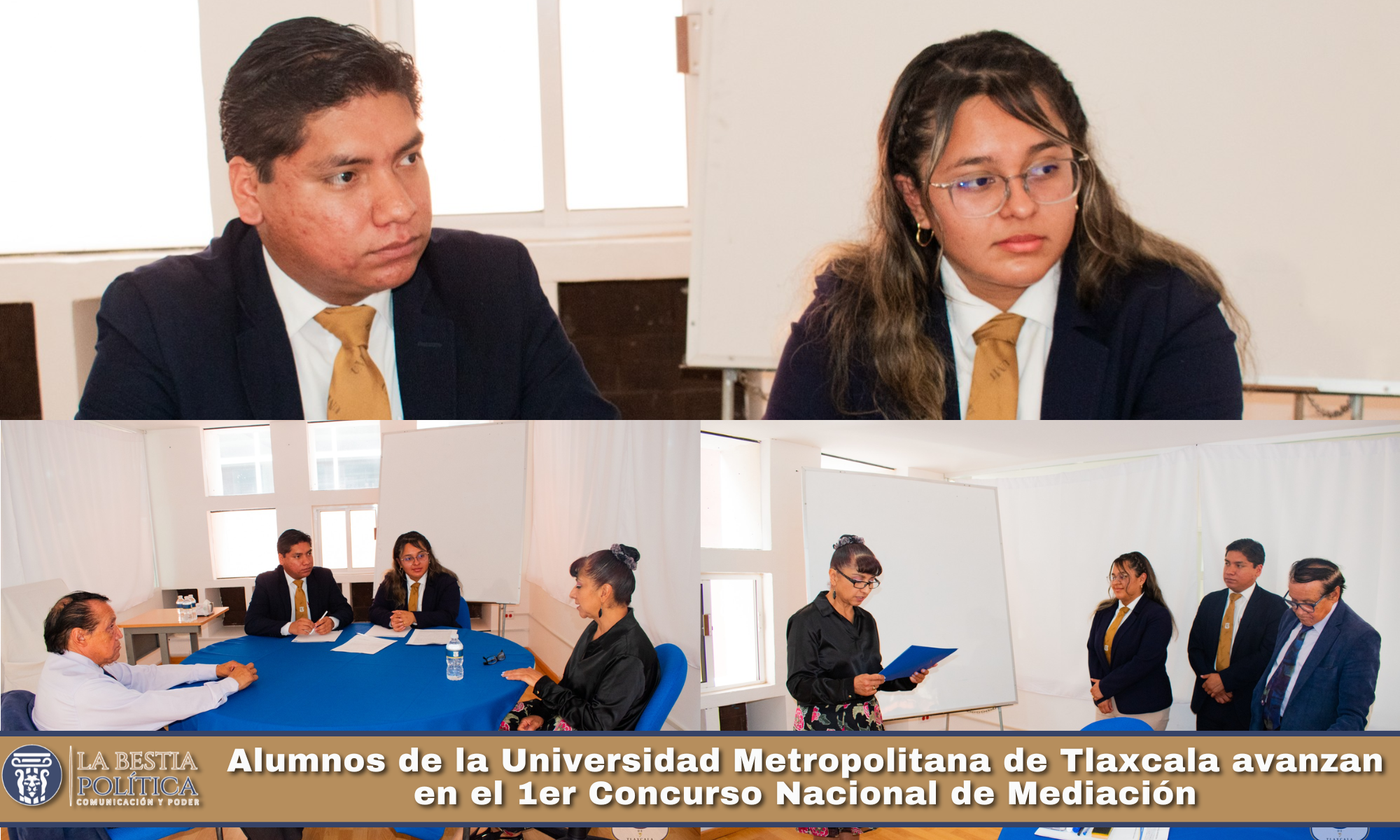 La Universidad Metropolitana de Tlaxcala (UMT) felicitó con orgullo a sus estudiantes Ángela Sofía Calderón Hernández, de séptimo semestre, y Antonio Ánimas Portillo, de quinto semestre, quienes lograron avanzar a la Fase Eliminatoria del 1er Concurso Nacional de Mediación, organizado por la Facultad de Derecho y Ciencias Políticas de la Universidad Autónoma de Tamaulipas (UAT).
