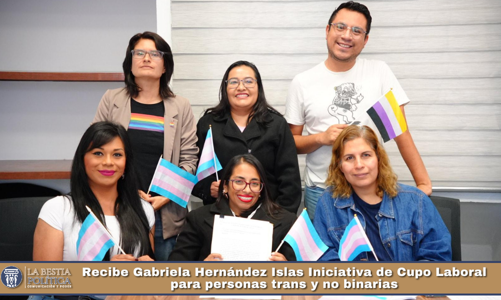La diputada Gabriela Hernández Islas, presidenta de la Comisión de Derechos Humanos, Grupos Vulnerables y Derecho de Niñas, Niños y Adolescentes recibió este martes en el Congreso del Estado de Tlaxcala la iniciativa de Cupo Laboral para Personas Trans y No Binarias, presentada por activistas de la diversidad sexual y de género, integrantes de la Coalición Mexicana LGBTIQANB+ y la Colectivx Diversidad, acompañados por la titular de la Oficina de Atención a la Diversidad Sexual de la Secretaría de Cultura de Tlaxcala.