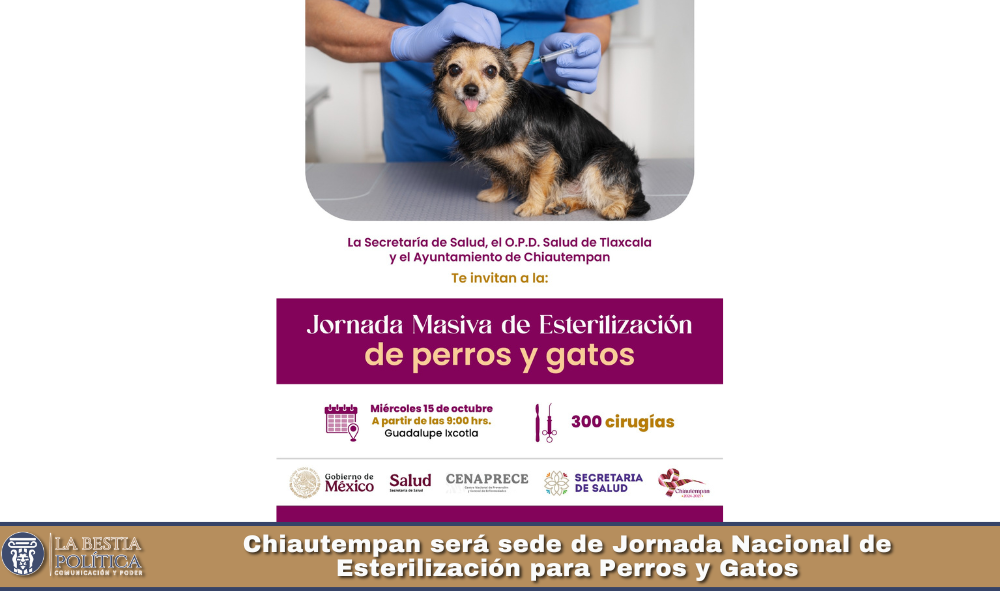 En el marco del 4º Taller Nacional de Esterilización Quirúrgica de Perros y Gatos, organizado por la Secretaría de Salud del Gobierno de México y el O.P.D. Salud de Tlaxcala, en coordinación con el Ayuntamiento de Chiautempan, se llevará a cabo una jornada masiva de esterilización gratuita en esta demarcación.