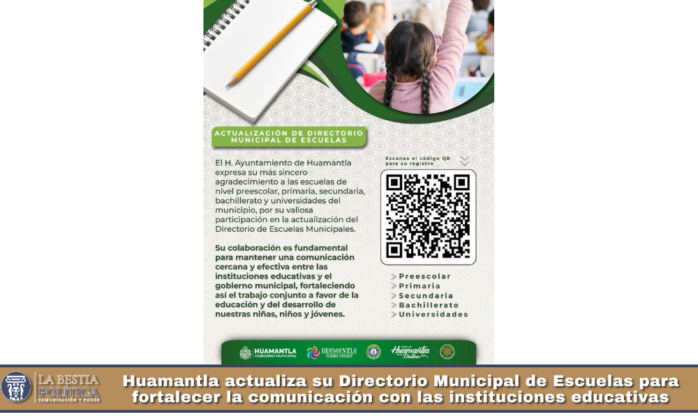El H. Ayuntamiento de Huamantla invita a todas las instituciones educativas de nivel preescolar, primaria, secundaria, bachillerato y universidades a participar en la actualización del Directorio Municipal de Escuelas, con el objetivo de mantener una comunicación más directa y efectiva con cada plantel.
