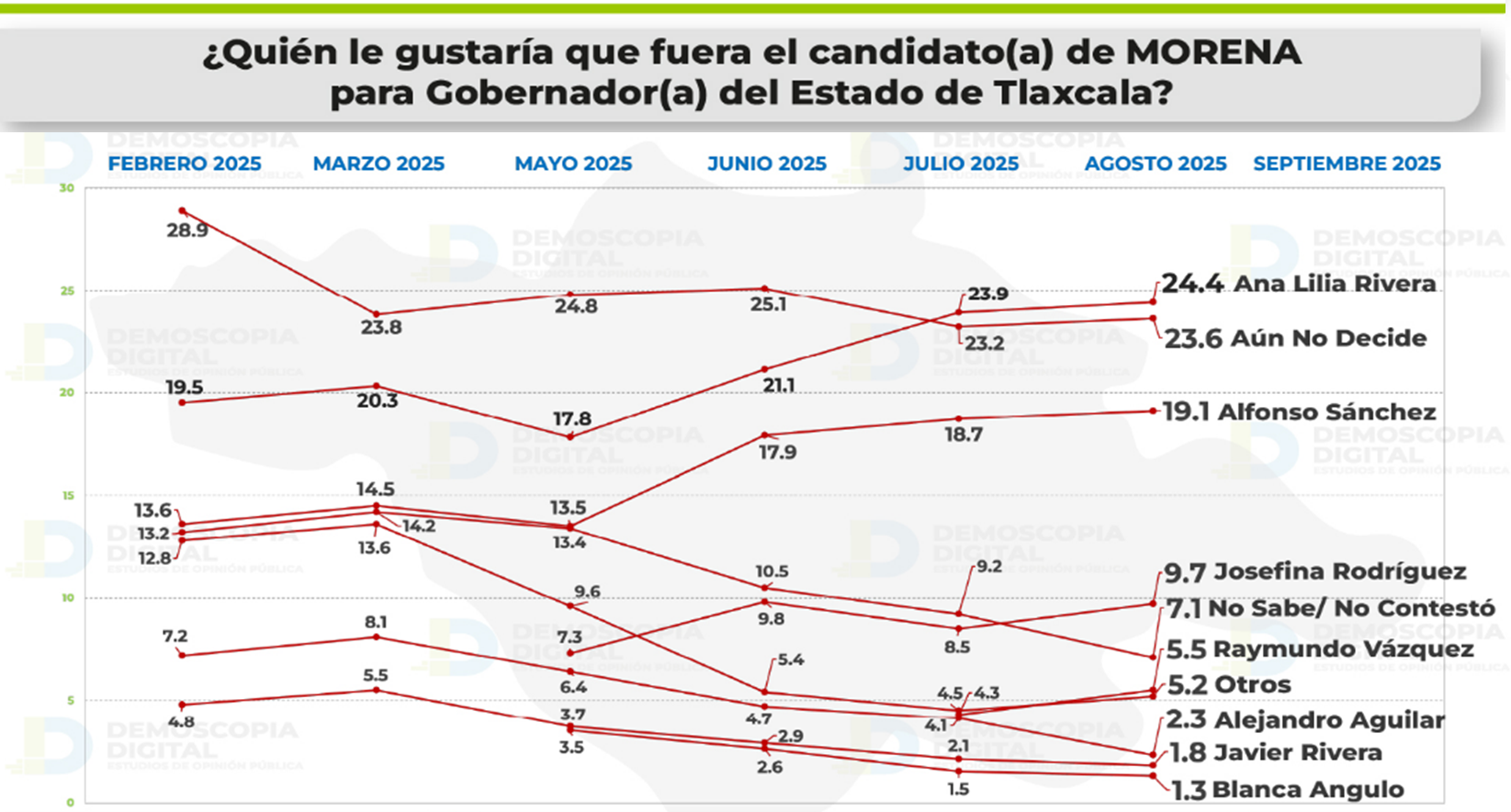 La sucesión inició el mismísimo 1 de septiembre de 2024, cuando la gobernadora Cuellar, le dio todo el respaldo al recién estrenado alcalde capitalino, Alfonso Sánchez, se encargó de la asistencia de toda la clase política en el estado a dicho evento, y dio inicio a una serie de eventos encaminado a encumbrar al Delfín de la nueva historia, no ahondaré en las demás acciones que desde el gobierno se inclinaron, hacia el cada vez mas desprestigiado alcalde, porque no quiero desviar el tema central de esta opinión; la sucesión quedó inaugurada y aunque Sánchez García, arrancó como favorito, más interesadas e interesados se manifestaron al respecto. Así se puede constatar en la encuesta que publica RUBRUM en diciembre del año pasado, en la cual se da cuenta de los nombres que aspiran por morena, Ana Lilia Rivera, Alfonso Sánchez, Dulce Silva, Alejandro Aguilar, Josefina Rodríguez Fernando León, y Luis Vargas. Siendo la Senadora, Rivera Rivera, la que encabezaba la medición de esa empresa y así, en las que se fueron sumando como Massive Caller, Demoscopia Digital y Logicial, que han medido desde enero a la Fecha, con el tiempo, se han incorporado algunas encuestadoras nacionales más, como GOBERNARTE, SRC, CIPRESO, y las locales, IMPULSO MERCADOLÓGICO, así como NUMETIKA. Pero no solo se incorporaron nuevas empresas en la carrera sucesoria, también paulatinamente se incorporaron nuevos tiradores, tales como Raymundo Vázquez Conchas, Oscar Flores, Carlos Augusto Pérez, Homero Meneses, Marcela González y más recientemente, Vicente Pérez. En este sentido, tuve la oportunidad de hacer un ejercicio, llamado Oraculuss a la Tlaxcalteca 1, en el cual di cuenta de los diferentes posicionamientos de todos los aspirantes morenistas, de acuerdo a un promedio de 10 estudios, tanto nacionales como locales, en ese estudio y en diversas columnas, he afirmado, que los aspirantes de morena, se agrupan en 3 diferentes corrientes: