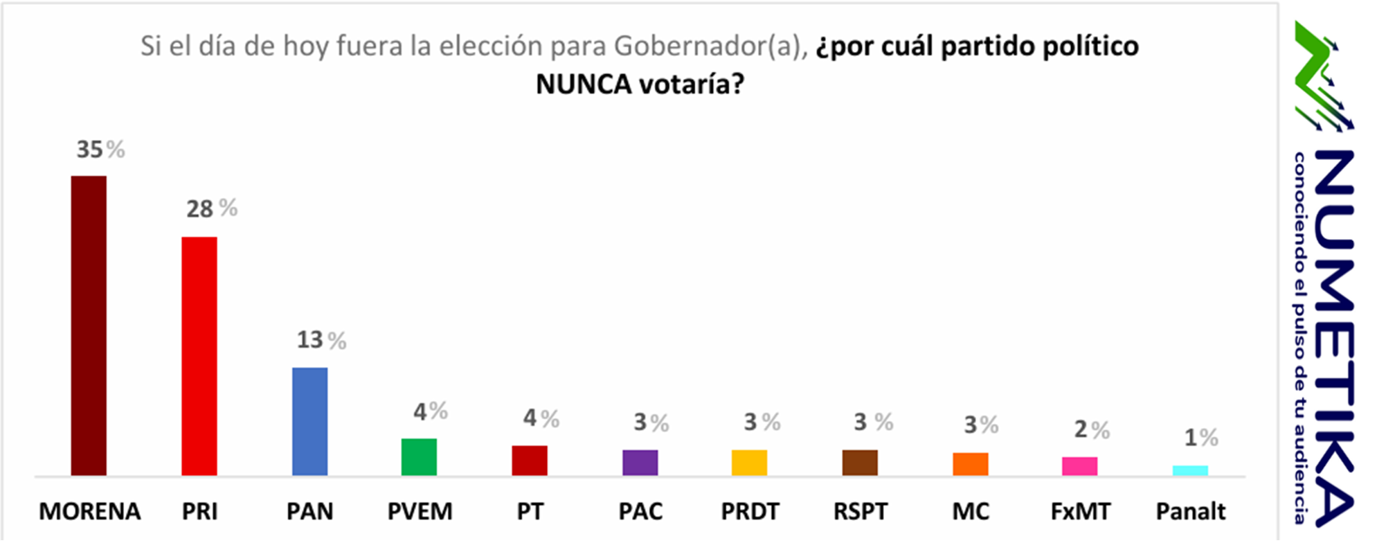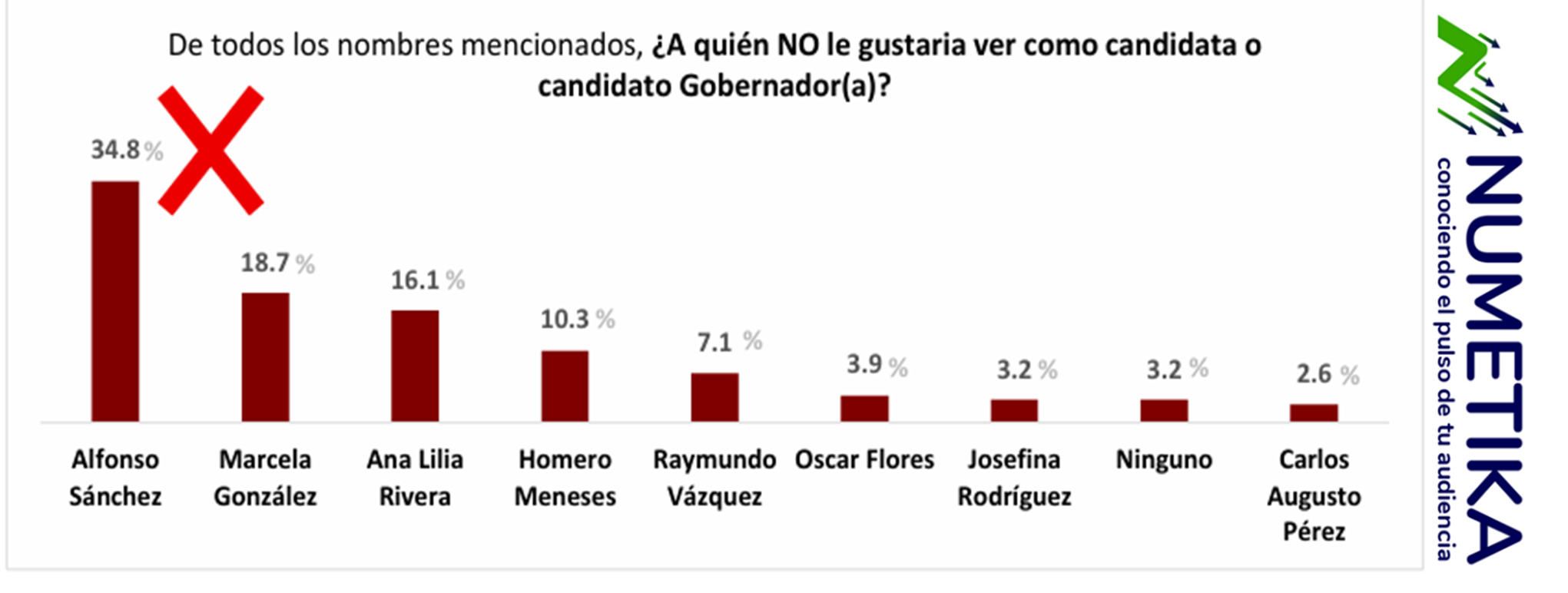 Esta contienda, esta apretada con apenas 5 puntos de diferencia entre primer y segundo lugar, pero tiene una indicación clara, por lo cual el siguiente factor, debe ser la negatividad, como DD, no reporta este dato, tomaremos el de NUMETIKA, quien midió el rechazo para el mismo mes:Þ