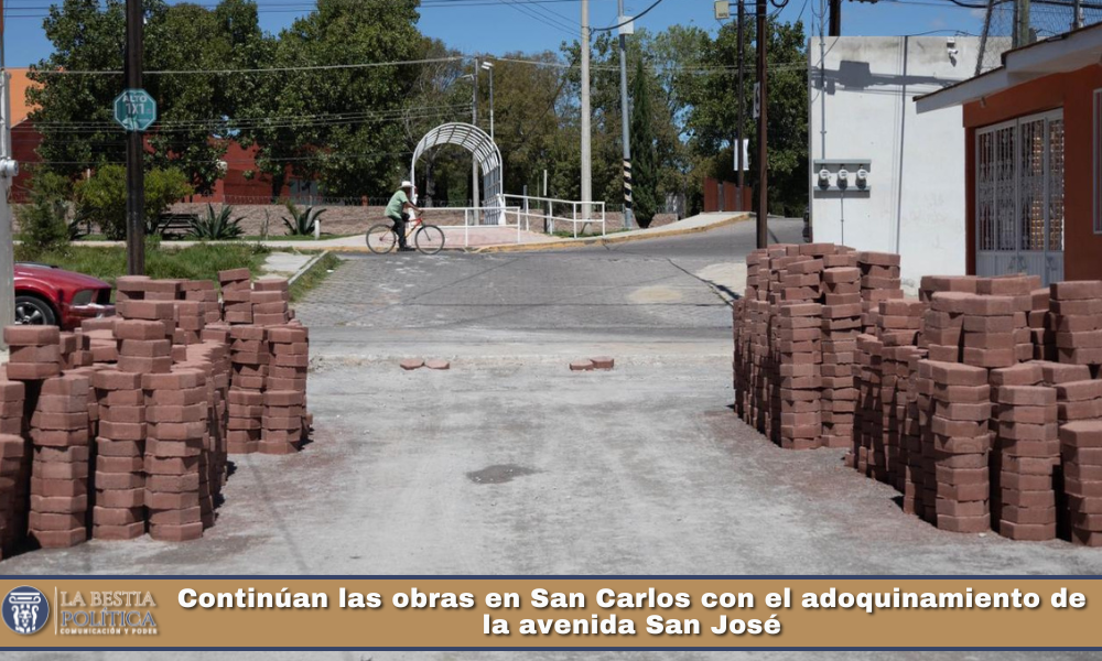 En la unidad habitacional de San Carlos, avanzan los trabajos de adoquinamiento de la avenida San José, una obra que facilitará el tránsito vehicular y peatonal, beneficiando directamente a las y los vecinos del barrio de San Lucas.