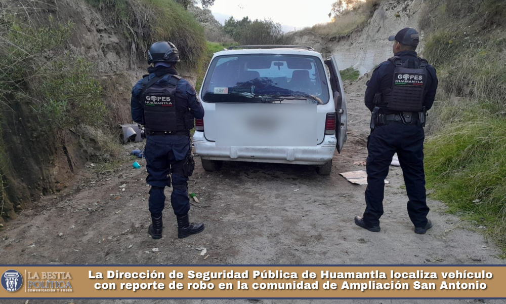 La Dirección de Seguridad Pública, Tránsito y Protección Civil Municipal de Huamantla informa que, como parte de los recorridos de vigilancia y prevención del delito, elementos del grupo GOPES localizaron un vehículo con reporte de robo en la zona de Ampliación San Antonio.