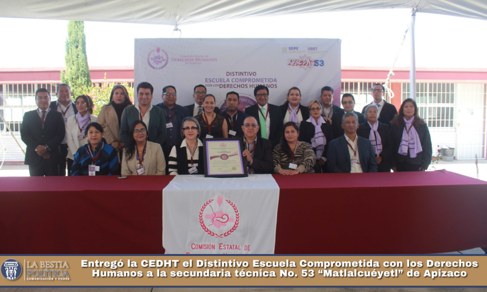 En el marco de sus acciones de difusión y promoción del respeto a los derechos humanos en espacios educativos, la Comisión Estatal de Derechos Humanos de Tlaxcala (CEDHT) entregó el Distintivo Escuela Comprometida con los Derechos Humanos a la escuela Secundaria Técnica #53 “Matlalcuéyetl”, primera institución educativa de carácter pública en obtener este reconocimiento, la cual está ubicada en la colonia Loma Florida del municipio de Apizaco.