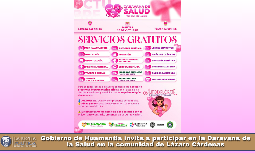El Gobierno Municipal de Huamantla, a través del Sistema Municipal para el Desarrollo Integral de la Familia (SMDIF), invita a la ciudadanía a participar en la Caravana de la Salud, que se llevará a cabo este martes 28 de octubre, de 10:00 a 13:00 horas, en la comunidad de Lázaro Cárdenas.