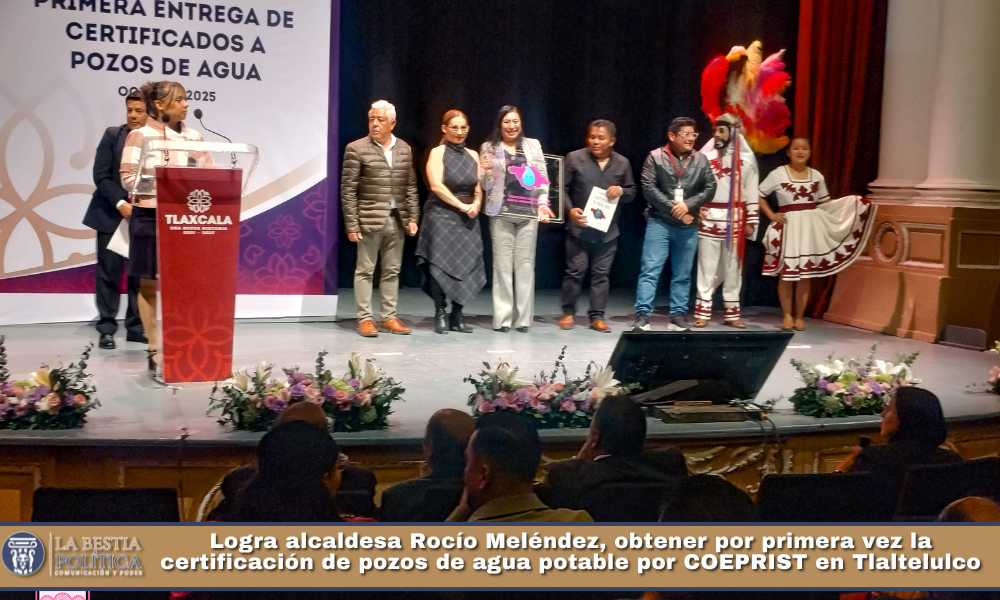 En el marco del evento de entrega de certificación de pozos 2025 “Municipio comprometido con el ambiente y la salud”, le fue entregado el certificado de los pozos de Tlaltelulco a la alcaldesa Rocío Meléndez y al síndico municipal, el cual autentifica el uso de agua completamente seguro para los Tlaltelulquenses.