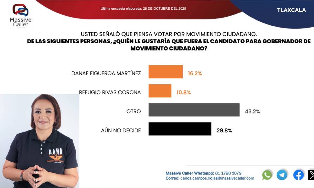 Fabiola MÁRQUEZ/ La más reciente encuesta de Massive Caller, elaborada el 28 de octubre de 2025, revela que Danae Figueroa Martínez se posiciona como la figura más reconocida y con mayor respaldo dentro de Movimiento Ciudadano en Tlaxcala, rumbo a la contienda por la gubernatura de 2027.