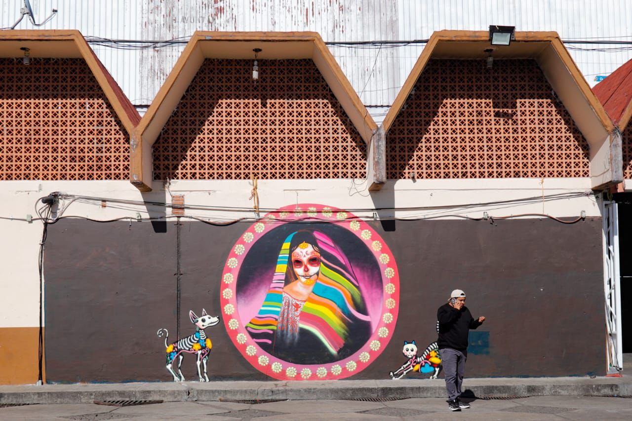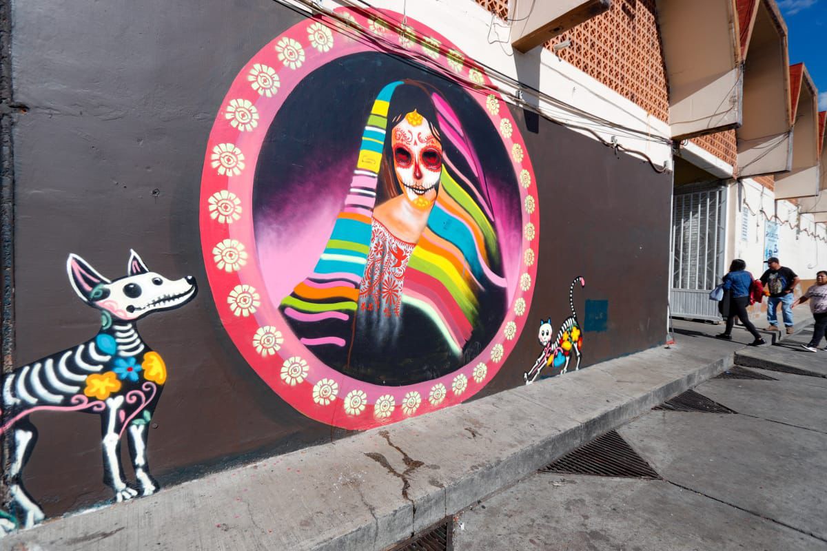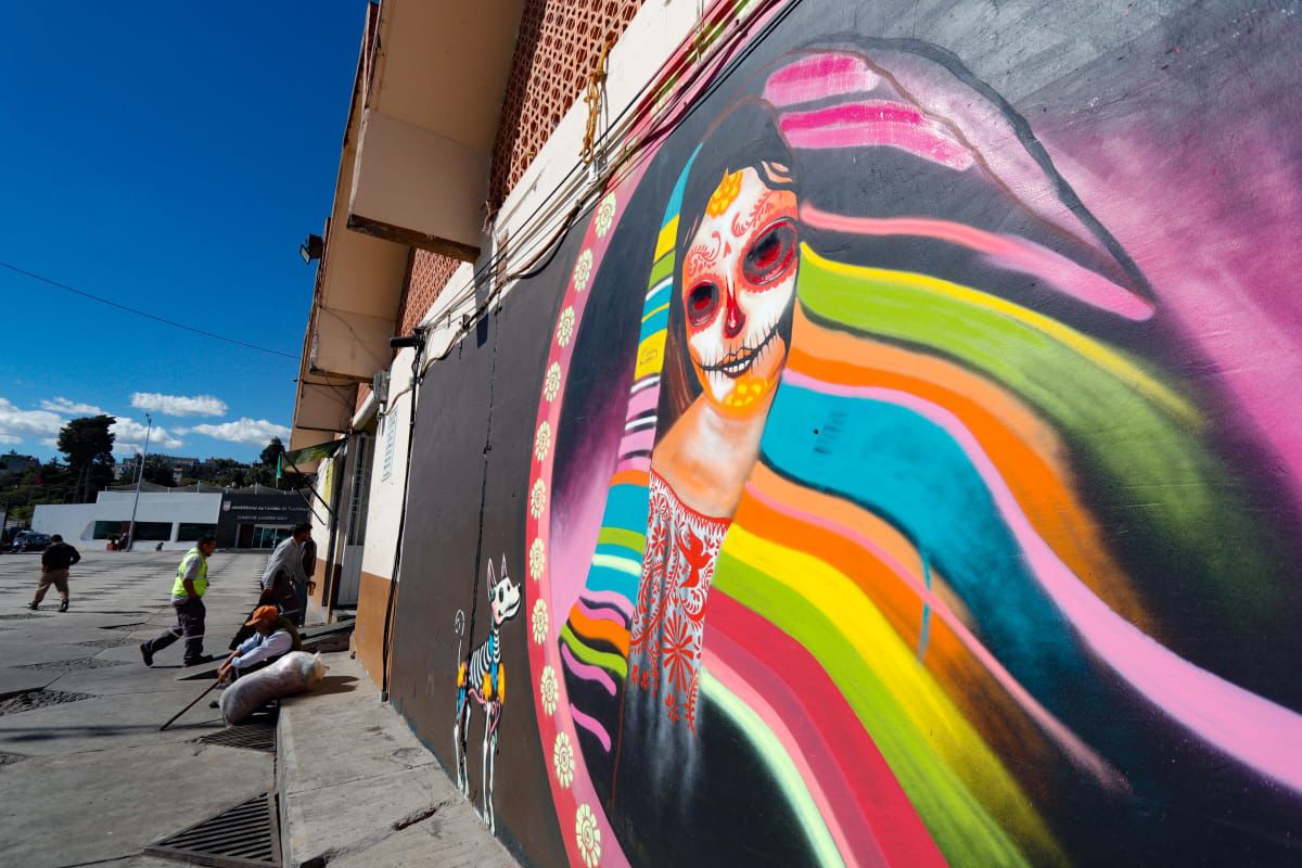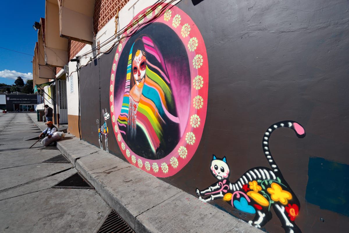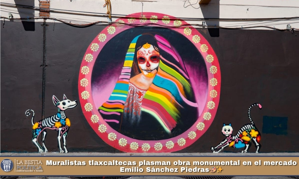 En el corazón de Tlaxcala capital, un grupo de muralistas tlaxcaltecas dio vida a una obra monumental en uno de los muros del mercado Emilio Sánchez Piedras, con una imagen alusiva a la temporada de Día de Muertos.
