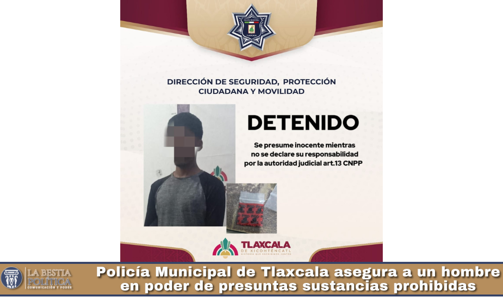 Resultado de las acciones permanentes de vigilancia que realiza la Dirección de Seguridad, Protección Ciudadana y Movilidad del Ayuntamiento de Tlaxcala, fue asegurado un hombre en posesión de presuntas sustancias prohibidas sobre la calle Ribereña, a la altura del puente Puebla–Tlaxcala.