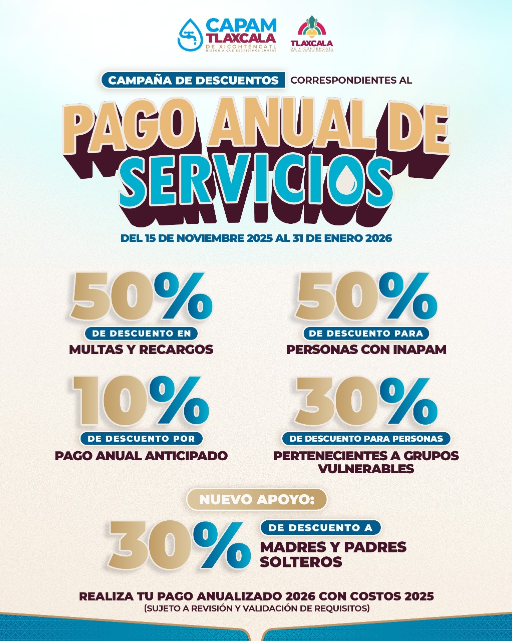 Para mayores informes, los interesados pueden acudir a las oficinas de la CAPAM, ubicadas en Calle 20 de Noviembre No. 46-A, en el centro de Tlaxcala, o consultar los horarios de atención a través de “Xicoh”, el asistente virtual del Ayuntamiento, disponible en WhatsApp al 246 221 99 14.