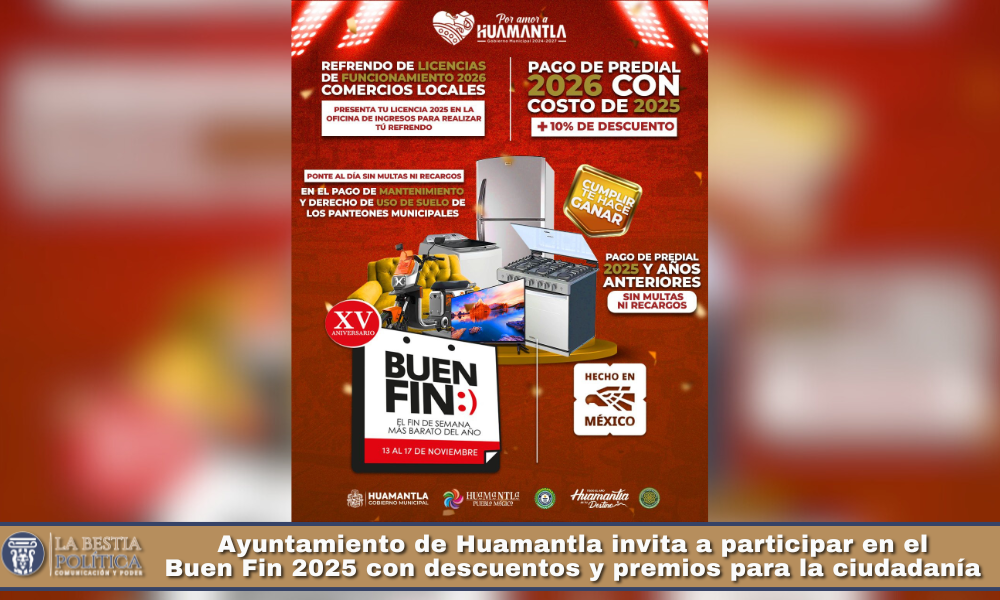 Con el objetivo de apoyar la economía de las familias huamantlecas y fomentar la cultura de cumplimiento, el Gobierno Municipal invita a participar en el Buen Fin Huamantla 2025, que se llevará a cabo del 13 al 17 de noviembre en las oficinas de Ingresos ubicadas en el Parque Juárez, en un horario de 9:00 a 18:00 horas.