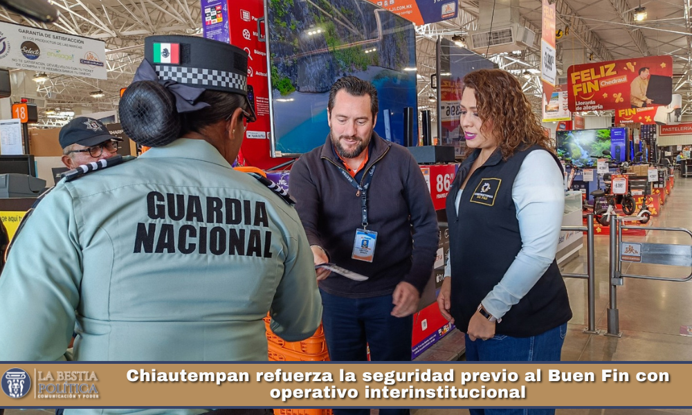 El Gobierno Municipal de Chiautempan, encabezado por la alcaldesa Blanca Angulo Meneses, implementó un operativo especial de seguridad enfocado en garantizar la paz y protección de comerciantes, locatarios y visitantes, en el marco de la próxima jornada del Buen Fin.