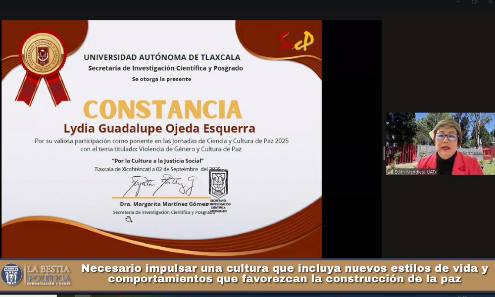 Las universidades tienen que hablar de una cultura de paz que atienda la perspectiva de género y diferenciar las violencias por razones de género que viven los diversos grupos sociales, afirmó la Licenciada Lydia Guadalupe Ojeda Esquerra, quien por invitación de la Secretaría de Investigación Científica y Posgrado de la Universidad Autónoma de Tlaxcala (UATx) ofreció, en modalidad virtual, la conferencia “Violencia de género y cultura de paz”, quien también indicó que una de cada tres mujeres ha sido víctima de violencia física o sexual por parte de su pareja o de otras personas.