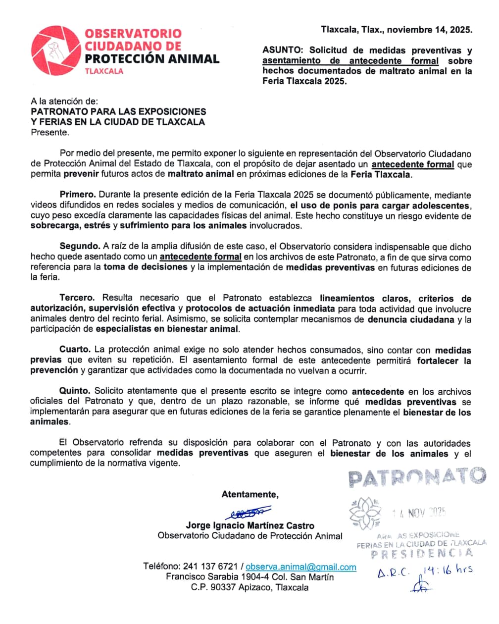 El Observatorio Ciudadano de Protección Animal (OCPA) informó que el pasado 14 de noviembre entregó un escrito oficial al Patronato para las Exposiciones y Ferias en la Ciudad de Tlaxcala, con el propósito de establecer un precedente institucional que fortalezca las acciones de supervisión, prevención y actuación en materia de bienestar animal durante las siguientes ediciones de la Feria de Tlaxcala.