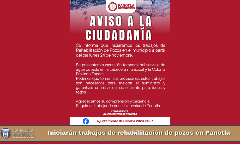 El H. Ayuntamiento de Panotla informa a toda la ciudadanía que darán inicio los trabajos de rehabilitación de pozos en el municipio, con el objetivo de mejorar la infraestructura hídrica y garantizar un servicio de agua potable más eficiente y de mayor calidad.