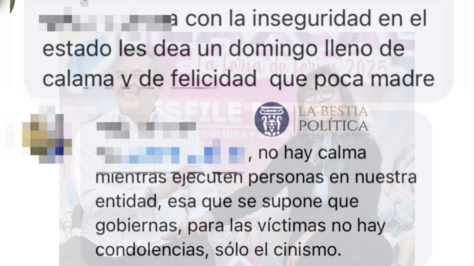 La aparente falta de una reacción o pronunciamiento oficial por parte del gobierno estatal sobre este crimen, contrastó con la publicación de la gobernadora en la que, acompañada de su esposo, expresaba: «Quise compartirles lo agradecida que estoy con la vida por el amor que me acompaña en los días buenos y en los difíciles también. Chava y yo les deseamos un domingo lleno de calma, familia y de momentos que te hacen sonreír».