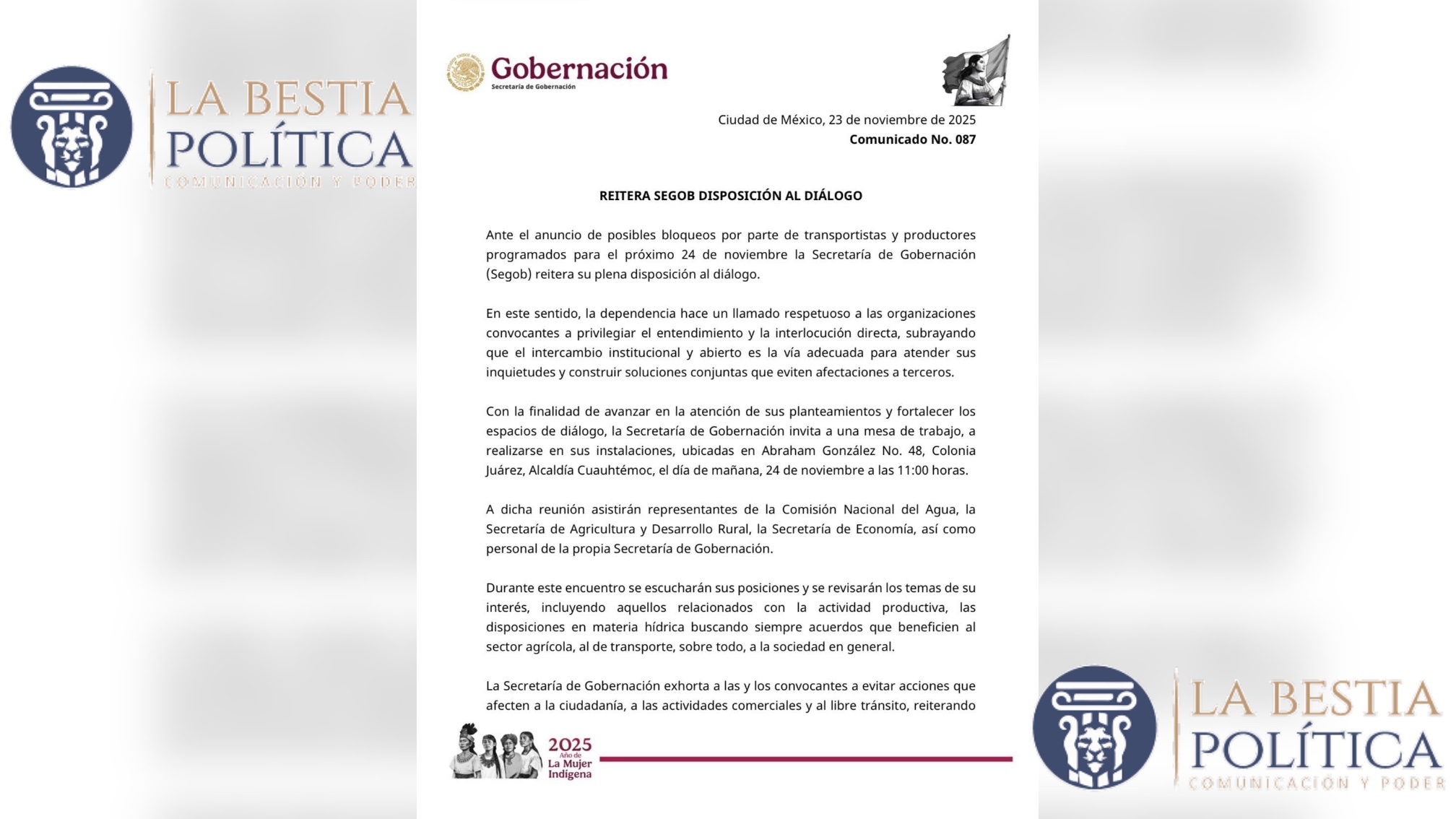 - Ante el anuncio de posibles bloqueos por parte de transportistas y productores para este 24 de noviembre, la Secretaría de Gobernación (Segob) reiteró su disposición al diálogo y convocó a una mesa de trabajo para atender las demandas de estos sectores.