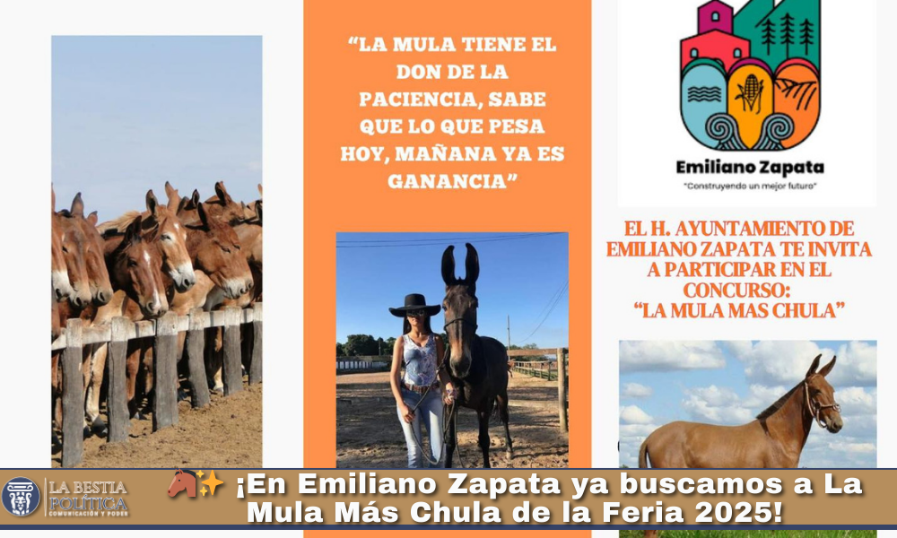 El Ayuntamiento de Emiliano Zapata anunció la realización del tradicional concurso “La Mula Más Chula”, uno de los eventos más esperados dentro de las actividades de la Feria Emiliano Zapata 2025. La competencia se llevará a cabo el sábado 29 de noviembre, a partir de las 09:00 horas, en la Plaza de Toros Cristo Rey.
