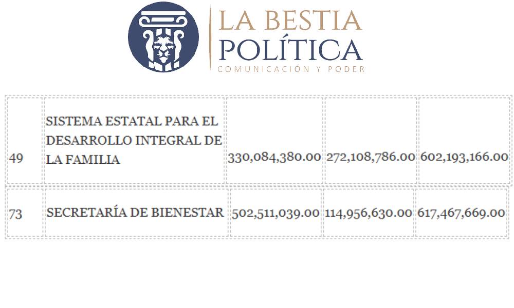 De acuerdo con el desglose presupuestal, al SEDIF, encabezado por Mariana Espinosa de los Monteros Cuéllar, se le asignarían $602,193,166.00 pesos. Por su parte, a la Secretaría del Bienestar, dirigida por su hermana, María Fernanda Espinosa de los Monteros Cuéllar, se le planea repartir $617,467,669.00 pesos. Ambas son hijas de la Gobernadora Lorena Cuellar Cisneros