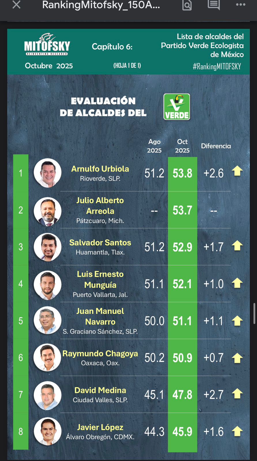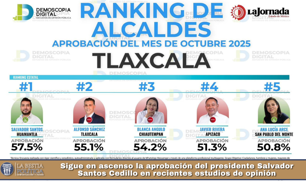 Este resultado coincide con la medición de Demoscopia Digital, que en su ranking estatal lo ubica en el primer lugar entre los alcaldes de Tlaxcala, obteniendo una aprobación del 57.5%, consolidándose como el mejor evaluado en la entidad.