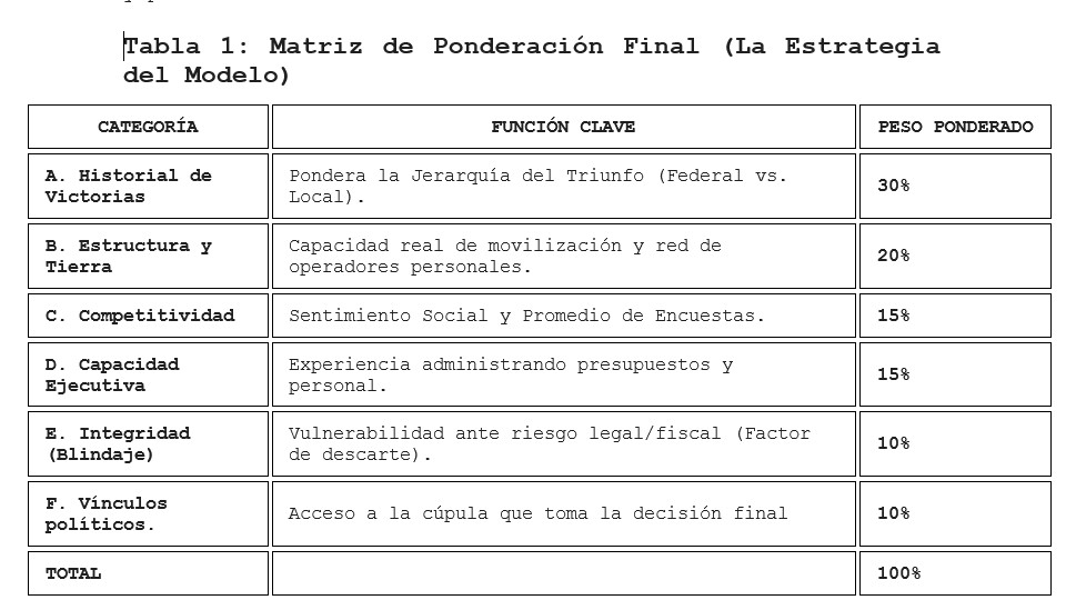Es en este contexto de aspiraciones donde se ha construido el presente modelo, para escrudiñar en las rutas de las y los aspirantes del partido en el poder, y reconocer sus fuerzas y sus debilidades, allí donde se definen las elecciones, en las urnas, en el territorio, donde las narrativas sucumben ante la realidad, allende al uso simple de estudios demoscópicos y se aplica en primera instancia en el contexto sucesorio al interior del partido en el poder en el estado de Tlaxcala. La validez del modelo radica en la asignación de pesos porcentuales específicos (ponderación) a cada dimensión, permitiendo obtener un puntaje final único sobre 100 puntos.»