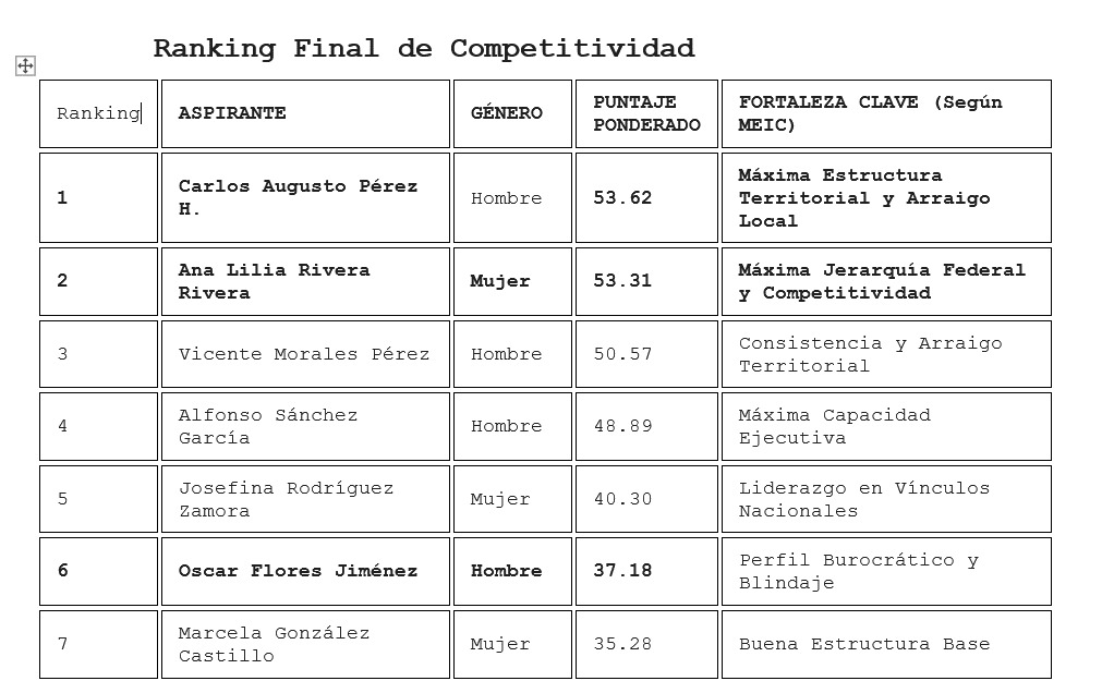 Con un Sesgo Metodológico Intencional: El MEIC Tlaxcala está sesgado deliberadamente hacia la trayectoria probada en las urnas (30%) y la capacidad de operación territorial (20%), reflejando el peso de la presencia territorial en el devenir histórico de los procesos electorales en Tlaxcala. La herramienta cuantifica datos duros (CV, cargos ganados) y variables cualitativas (Vínculos, Capacidad Ejecutiva) en una escala ponderada de 100 puntos, proporcionando una clasificación objetiva e integral.