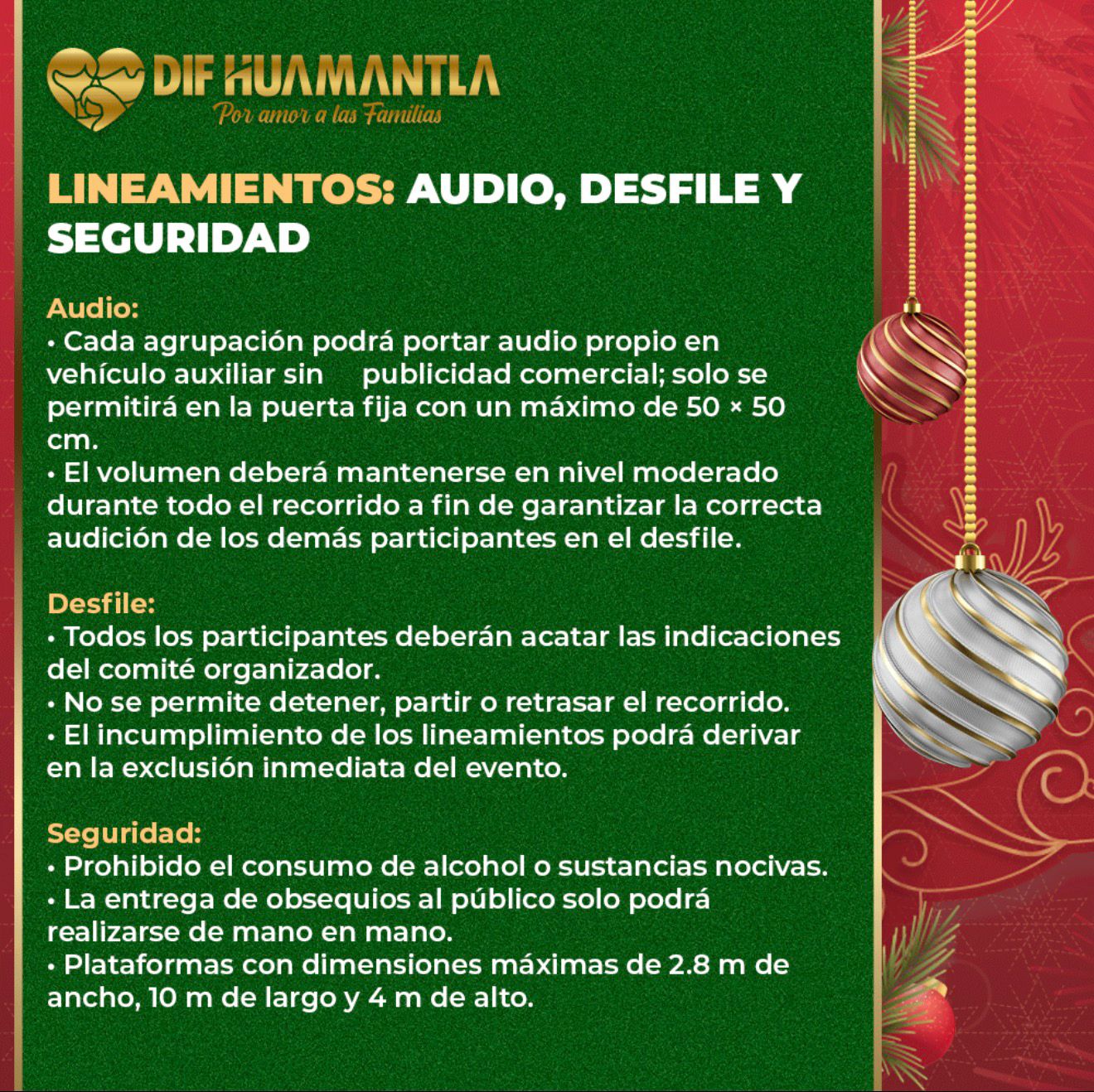 El SMDIF informó que todas las unidades participantes deberán cumplir con lineamientos de audio y seguridad. Las agrupaciones pueden llevar sonido propio, siempre en volumen moderado; queda estrictamente prohibido el consumo de alcohol o sustancias nocivas. Además, los carros alegóricos deberán respetar las medidas máximas permitidas: 2.8 metros de ancho, 10 metros de largo y 4 metros de altura.