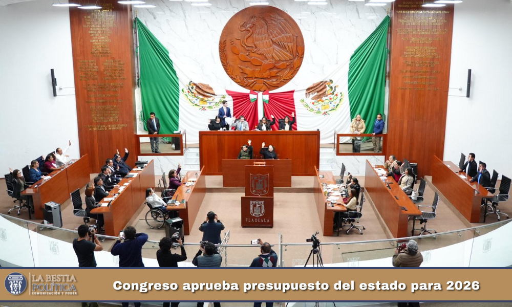 Las diputadas y diputados integrantes de la LXV Legislatura del Congreso del Estado aprobaron por unanimidad de los presentes el dictamen emitido por la Comisión de Finanzas y Fiscalización relativo al Presupuesto de Egresos del Estado de Tlaxcala para el ejercicio fiscal 2026, presentado por la gobernadora Lorena Cuéllar Cisneros. El documento prioriza objetivos como el fortalecimiento de la seguridad pública, la mejora del sistema de salud, el combate a la violencia, la impunidad y la corrupción; así como el impulso al crecimiento económico, la creación de empleos, el fortalecimiento educativo, la protección ambiental, la promoción de la equidad de género y el reconocimiento de la identidad histórica y cultural de comunidades indígenas y originarias.
