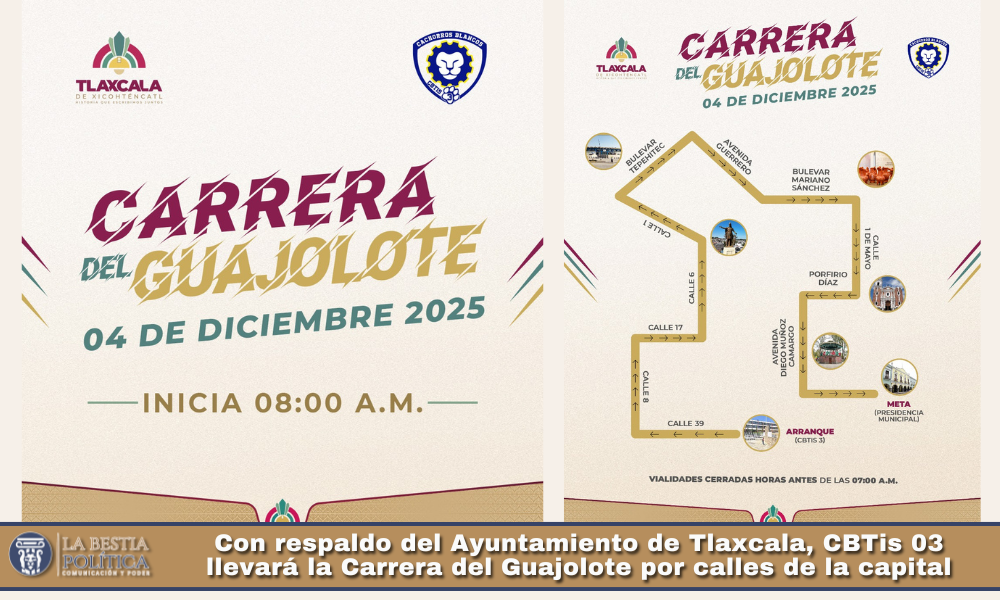 Este jueves 04 de diciembre, el Centro de Bachillerato Tecnológico, Industrial y de Servicios (CBTIS) 03, en colaboración con el Ayuntamiento de Tlaxcala que encabeza Alfonso Sánchez García, celebrará con entusiasmo su tradicional Carrera del Guajolote, un evento que cada año fomenta la convivencia y el deporte, y que en esta ocasión tendrá un toque muy especial, pues por primera vez recorrerá las principales calles de la capital.