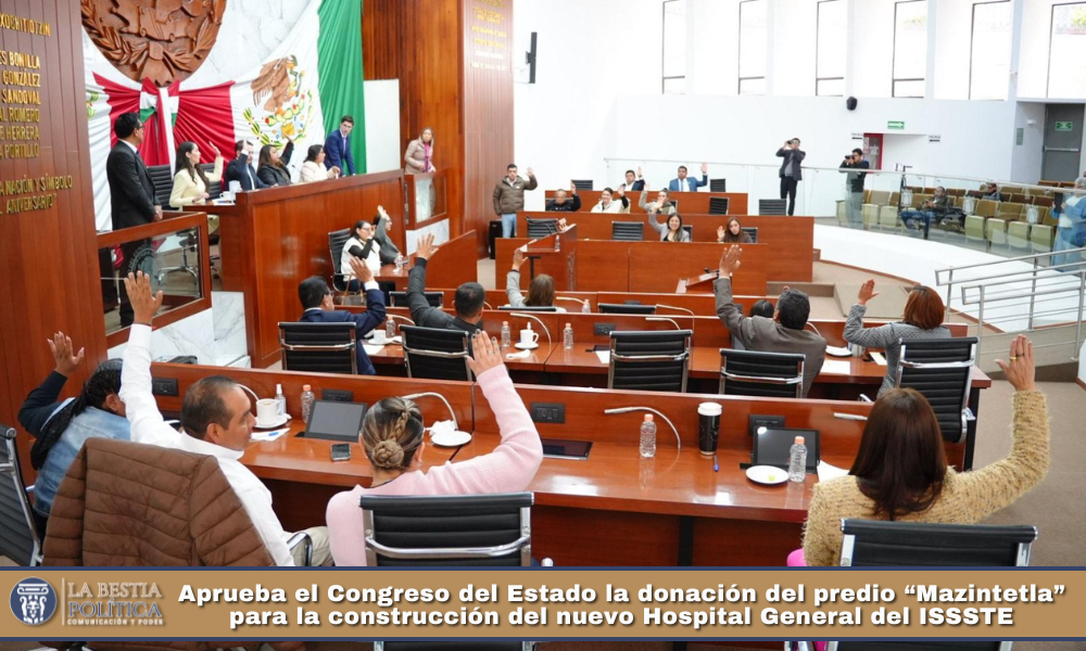 Las diputadas y diputados integrantes de la LXV Legislatura aprobaron por unanimidad la Iniciativa remitida por la gobernadora Lorena Cuéllar Cisneros, asistida por el secretario de Gobierno, Luis Antonio Ramírez Hernández, mediante la cual se solicitó la autorización para ejercer actos de dominio respecto de una fracción del predio “Mazintetla”, ubicado en la comunidad de Santa Anita Huiloac, municipio de Apizaco, con el propósito de donarlo al Gobierno Federal para la construcción de un nuevo Hospital General del Instituto de Seguridad y Servicios Sociales de los Trabajadores del Estado (ISSSTE).