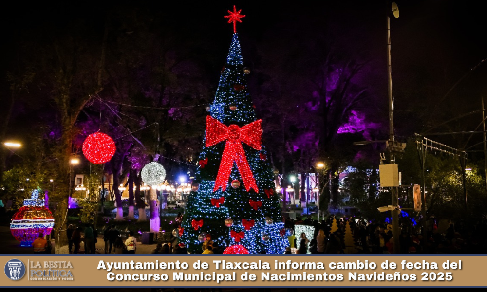 El Ayuntamiento de Tlaxcala informa que, debido a cuestiones climáticas y logísticas, el Concurso Municipal de Nacimientos Navideños 2025, originalmente programado para el 10 de diciembre, se pospone para el miércoles 17, fecha en la que las piezas participantes serán instaladas en la Plaza de la Constitución.