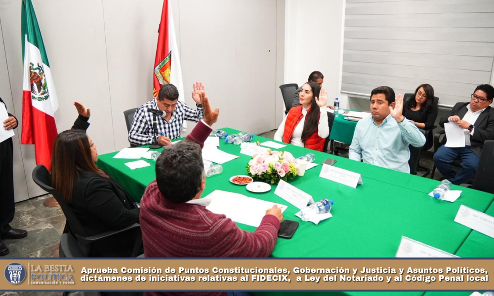 Este día, las y los diputados integrantes de la Comisión de Puntos Constitucionales, Gobernación y Justicia y Asuntos Políticos, que preside el diputado Jaciel González Herrera, aprobaron tres dictámenes correspondientes a la Iniciativa por el que expide el Decreto del Fideicomiso de la Ciudad Industrial de Xicoténcatl del Estado de Tlaxcala, así como, a la Iniciativa con Proyecto de Decreto por la que se reforman, adicionan y derogan diversas disposiciones de la Ley del Notariado para el Estado de Tlaxcala, ambas remitidas por el Ejecutivo del Estado, así como la Iniciativa por la que se reforman, adicionan y derogan diversas disposiciones del Código Penal para el Estado Libre y Soberano de Tlaxcala y de la Ley Orgánica de la Fiscalía General de Justicia del Estado de Tlaxcala, presentada por el diputado David Martínez del Razo.